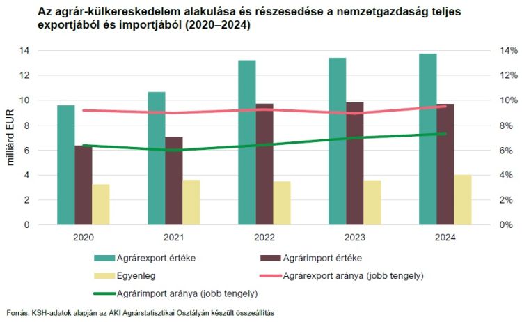 Az AKI legfrissebb jelentése szerint a mezőgazdasági és élelmiszeripari termékek külkereskedelmi egyenlege 13,1 százalékkal javult 2024-ben, miután 464 millió euróval többet hozott a konyhára, mint 2023-ban. Az agrárexport aránya a teljes nemzetgazdasági exporton belül 0,5 százalékponttal 9,5 százalékra emelkedett.