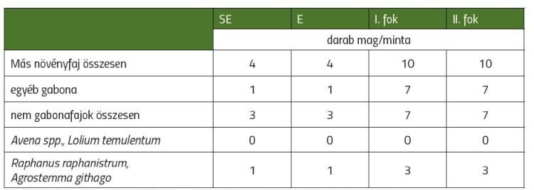A szemléket követően megkezdődhetett a betakarítás és a tisztítás. A felügyeleti szerv munkatársai 2024-ben megközelítőleg 1100 kalászosvetőmag-mintát vizsgáltak meg, és adták ki ezekről a vetőmag-minősítő bizonyítványokat. Ezekből véletlenszerűen választottunk ki 200 mintát, és ezek átlagát mutatjuk be. A tisztasági vizsgálatok során a minták 18%-a esetén találtak idegen magot. Gyomnövények esetében Galium fajok fordultak elő 25%-os részesedéssel, a Bromus fajok 5%-ban, Rumex spp. és Fagoryrum spp. 4-4%-ban, 7%-ban pedig egyéb gyommagvak. Idegen fajú kultúrnövények tekintetében a búzamintákban tritikálé 33%-os aránnyal, míg árpa 22%-ban fordult elő. Kizárásra került egy tétel a megengedett maximális idegenmag-tartalom túllépése miatt, itt az 500 gramm mintában több mint 7 szem tritikálémagot és egyéb gyomnövény magjait is megtalálták.