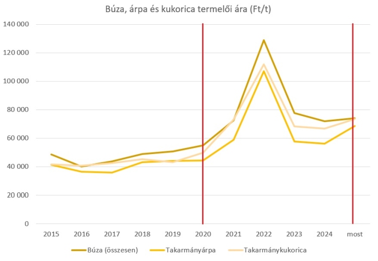 Az AKI PÁIR adatai szerint most a búzákat és a kukoricát 73-74 ezer forint körüli áron vásárolják, de a minőség függvényében nagyok az ajánlati kilengések. A takarmányárpa 68-69 ezer forintot ér átlagban. A 2020-ig tartó „békeévek” után az árak egy 35–55%-kal magasabb szintre álltak be, általánosságban 45%-os emelkedéssel kalkulálhatunk. Még sincs ok az örömre.