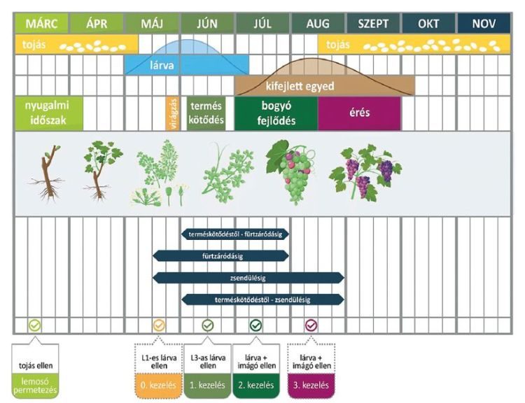 1. ábra. A szőlőkabóca életciklusa és az ajánlott növényvédelmi beavatkozások időpontjai