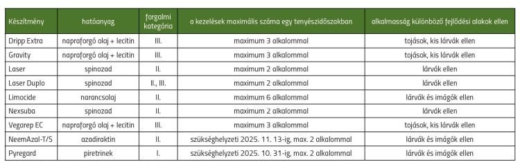 1. táblázat. Az ökológiai termesztésben az amerikai szőlőkabóca ellen engedélyezett készítmények