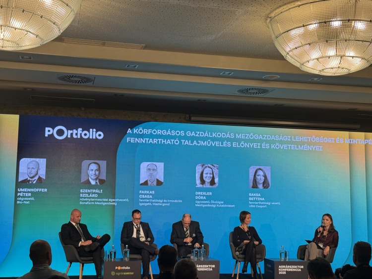 A magyar termőföldek állapota látványosan romlik, miközben a gazdák mozgástere egyre szűkül – a kérdés ma már nem az, hogy érdemes-e körforgásos gazdálkodásban gondolkodni, hanem az, mikor és hogyan térül meg. A Portfolio Agrárszektor 2025 konferencia siófoki kerekasztal-beszélgetésén („A körforgásos gazdálkodás mezőgazdasági lehetőségei és mintapéldái – fenntartható talajművelés előnyei és követelményei”) a talaj állapotáról, a szervesanyag-visszapótlásról és a gazdasági megtérülésről beszélgetett Umenhoffer Péter (cégvezető, Bio-Nat), dr. Drexler Dóra (ügyvezető, Ökológiai Mezőgazdasági Kutatóintézet), Szentpáli Szilárd (növénytermesztési ágazatvezető, Bonafarm Mezőgazdaság), Baksa Bettina (fenntarthatósági vezető, UBM Csoport) és Farkas Csaba (fenntarthatósági és innovációs igazgató, Mastergood).