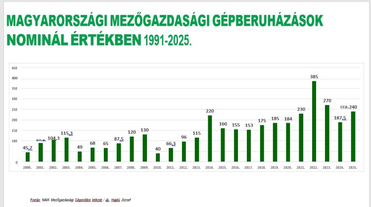 A termelők „kivárása” mögött az aszály mellett komoly gazdasági okok is állnak. A magyar mezőgazdasági gépberuházások értéke 2022-ben még 385 milliárd forint körül járt, 2023-ban 270 milliárdra, 2024-ben 187,5 milliárdra esett, és 2025-ben is csak mintegy 240 milliárd forintra kapaszkodott vissza. Közben a műtrágyaköltségek 12%-kal emelkedtek, a finanszírozási környezet pedig továbbra is nehéz: a sajtótájékoztatón elhangzottak szerint a hazai 3 havi BUBOR 3 százalékponttal haladja meg a 3 havi EURIBOR-t. Ilyen helyzetben nem meglepő, hogy az AXIÁL 2026-ra támogatásvezérelt keresletet, kivárást és eltolódást prognosztizál a másodlagos piac felé.