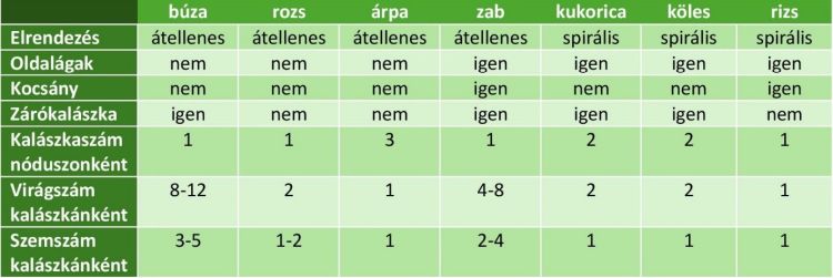 A főbb gabonafajok virágzatának tulajdonságai a következők (Sakuma és Schnurbusch, 2019):
